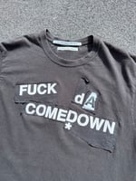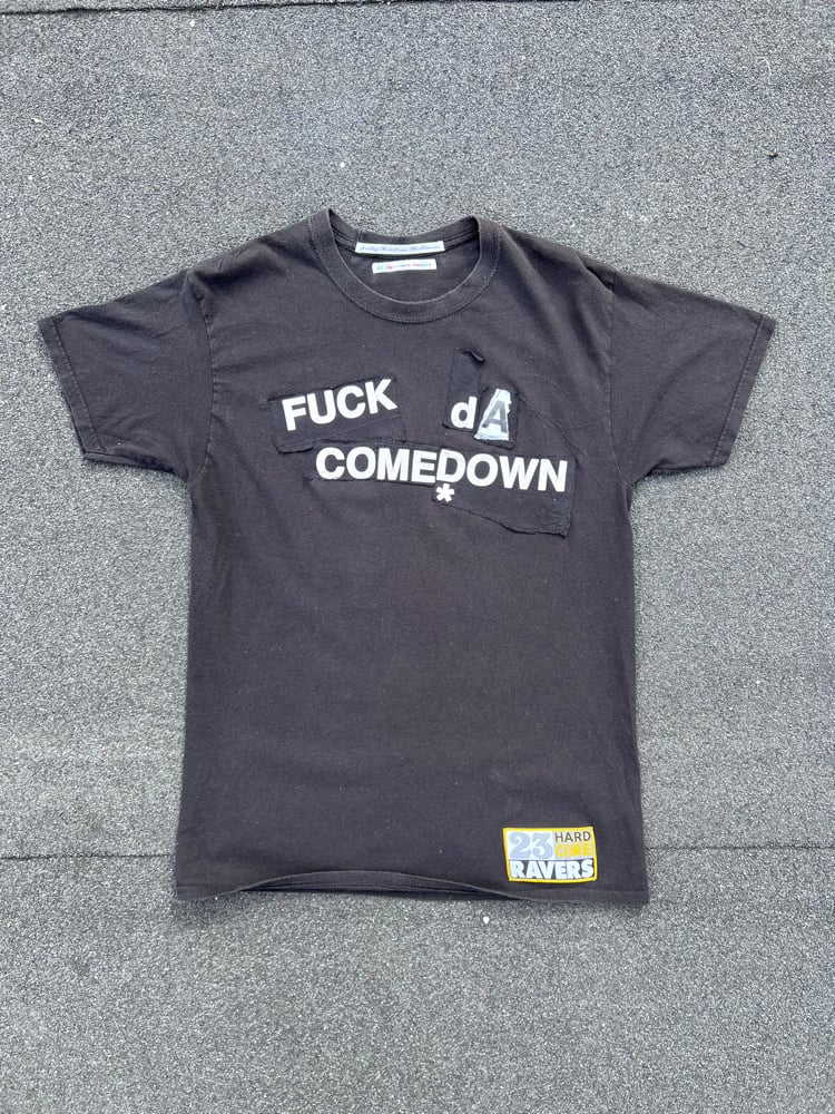 fabric collaged text on tee. Woven label at neck and 23hxc labelle at left front hem.