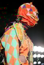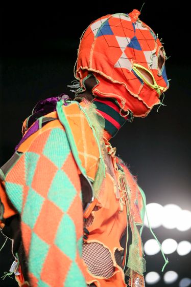gimp mask with cutesy ears made out of argyle socks, a neon zip and builder's sweatpant scraps hand and machine and overlock stitched together from my graduate collection - AW2021 C.R.A.P